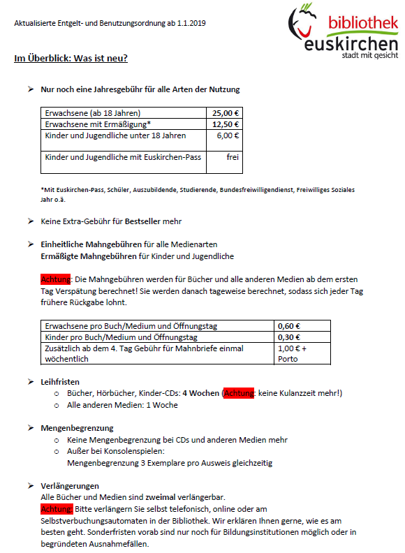 Der Rat der Stadt Euskirchen hat am 18. Dezember 2018 eine neue Entgelt- und Benutzungsordnung beschlossen, die ab sofort gültig ist. Ihr findet sie hier auf unserer Webseite.