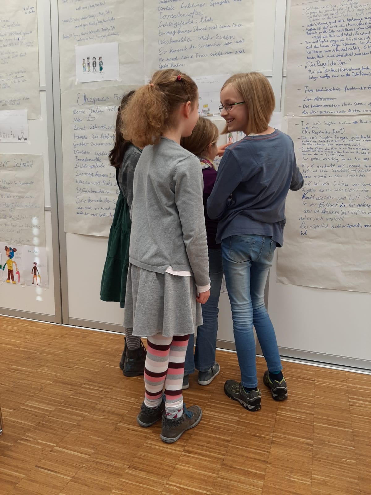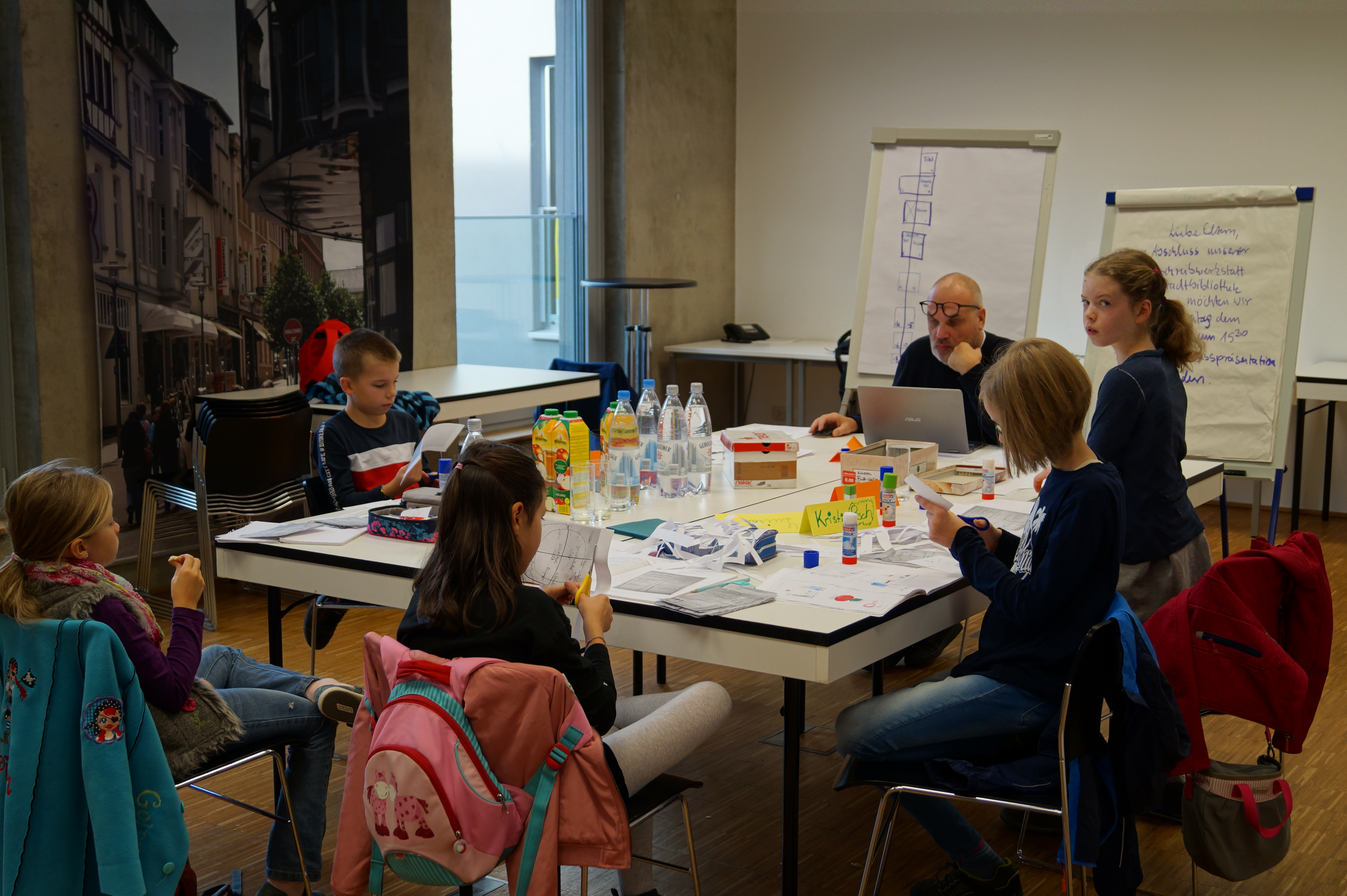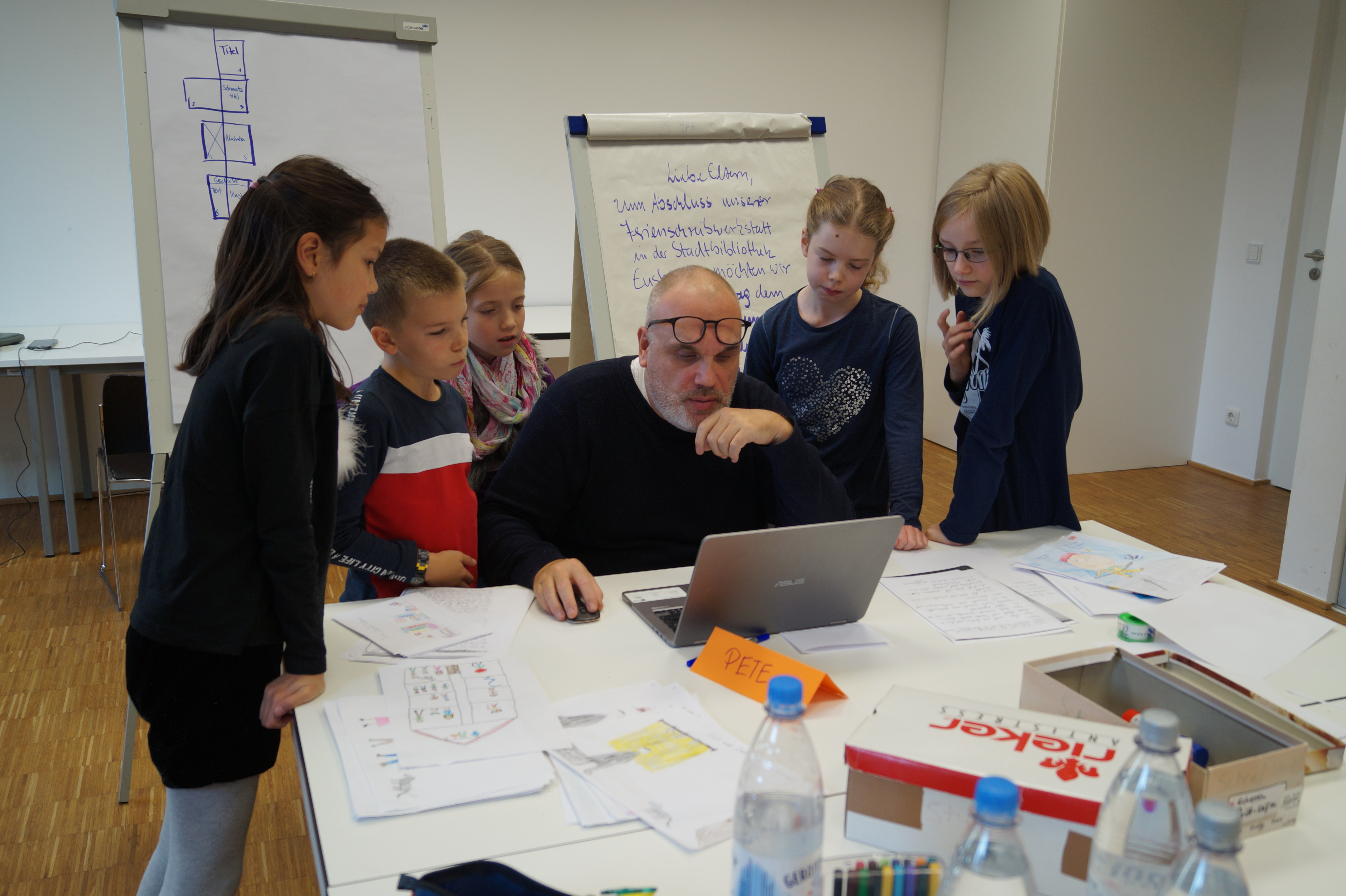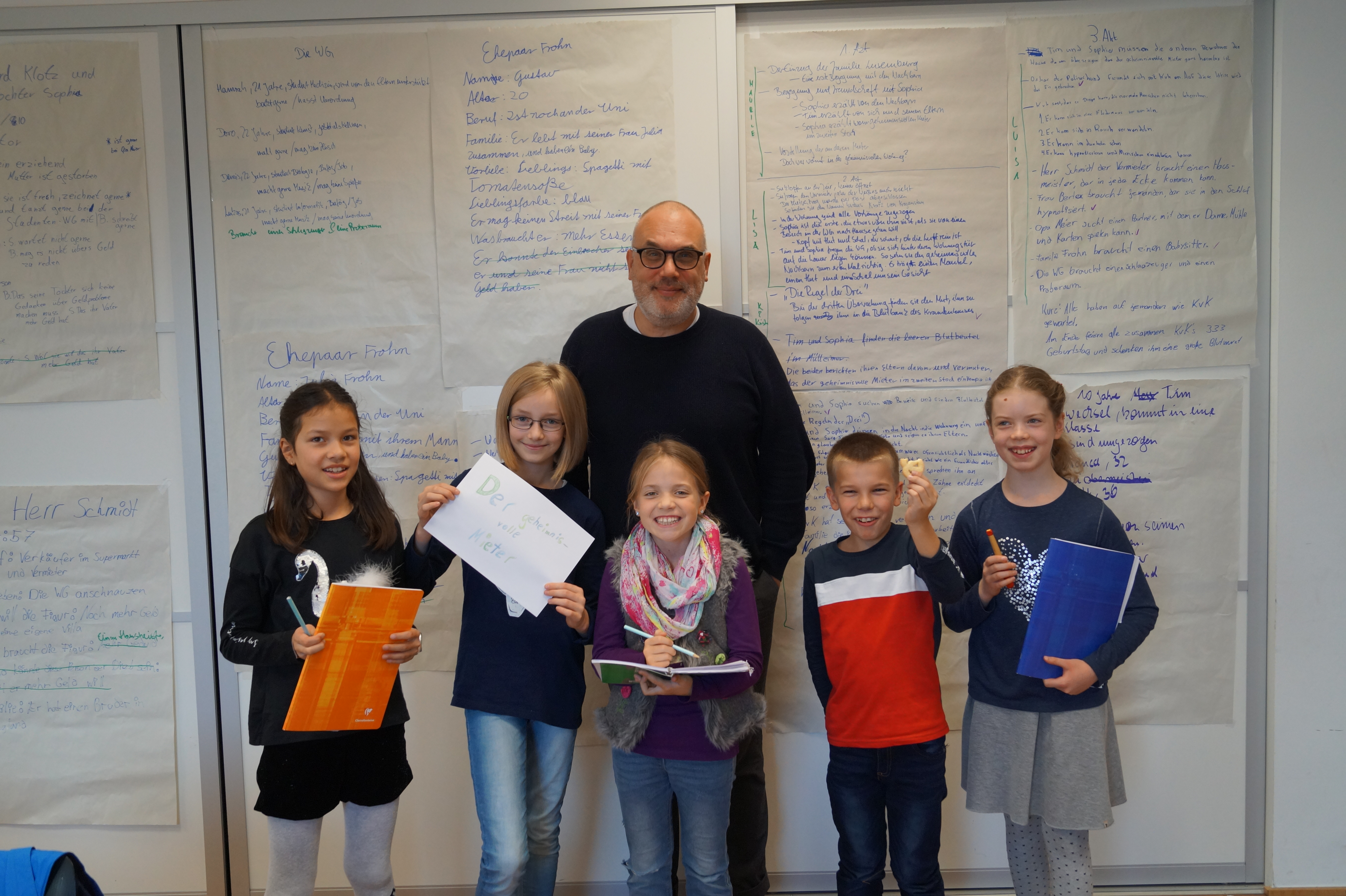 Auch für den Kinder- und Jugendbuchautor Peter Schwindt, der schon einige Schreibwerkstätten durchgeführt hat (u.a. auch schon bei uns), war dieses Tempo neu: Nicht ohne Stolz verkündete er bei der Abschlusspräsentation, dass diese Truppe, die im Laufe der Woche zu einem echt tollen Kreativteam zusammengewachsen ist, mit Abstand am weitesten gekommen ist. Am Ende liegt es nämlich an den Kindern selbst, was sie aus dem Workshop machen: Peter Schwindt vermittelt ihnen lediglich das Handwerkszeug, erklärt, wie man eine Geschichte grundsätzlich aufbaut, und hilft bei kleineren oder größeren Problemen im Kreativprozess.