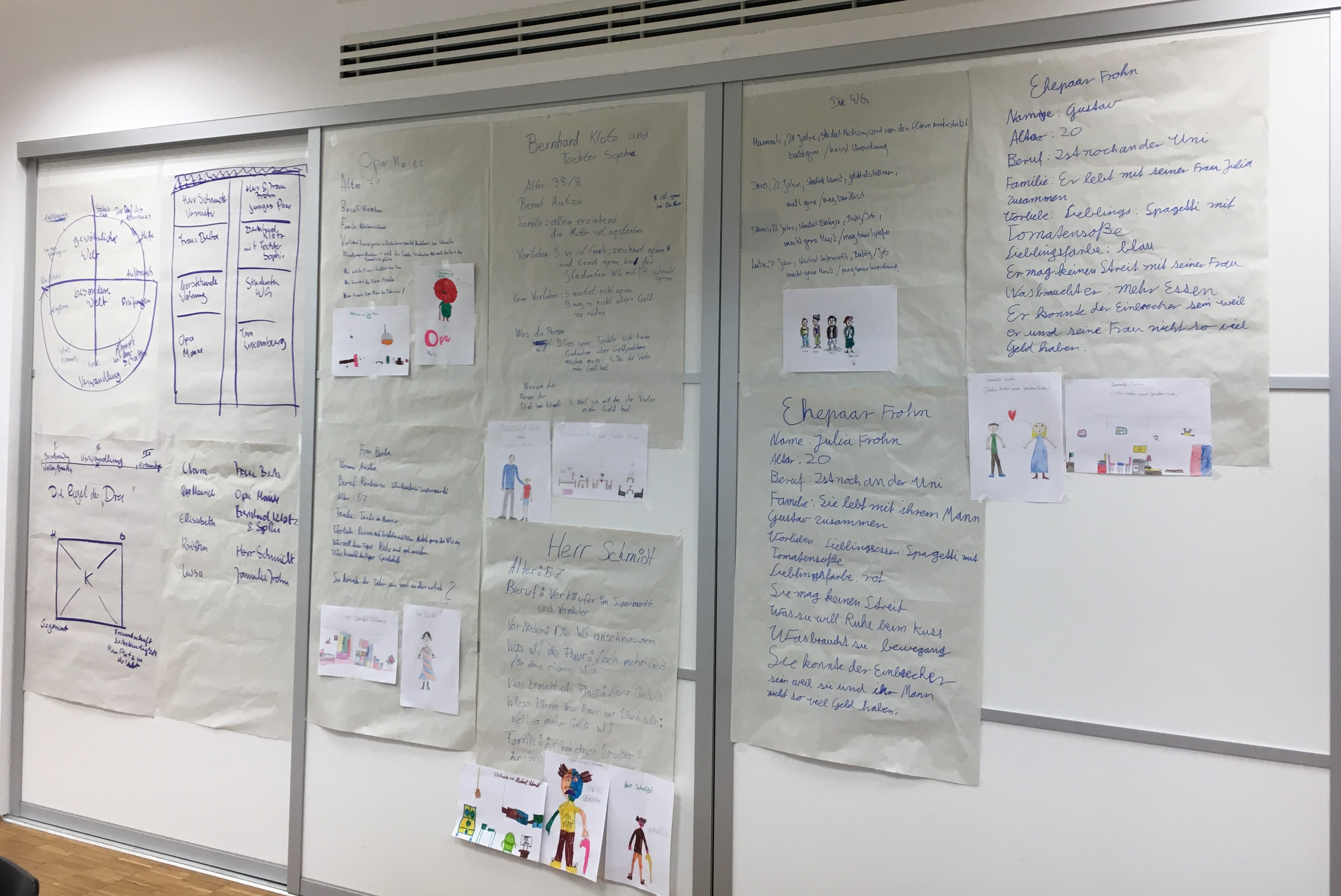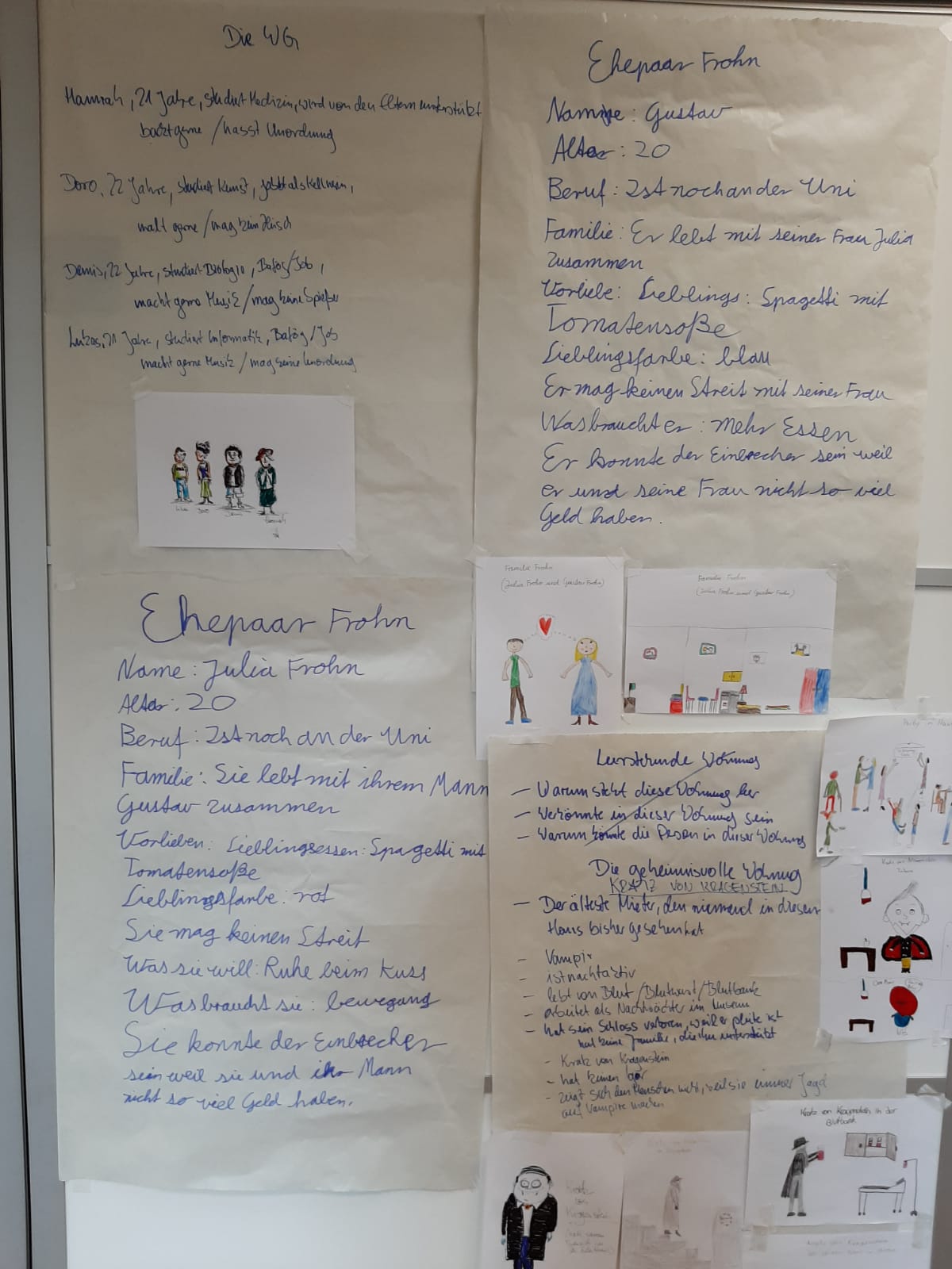 Was als Zielsetzung ziemlich ambitioniert klingt, schien für Clara, Luisa, Elisabeth, Kristin und Maurice total selbstverständlich: Schon nach dem ersten Tag schmückten etliche Flipchart-Seiten mit Figurenentwürfen und ersten Handlungsideen die Wände unseres Seminarraums und im Laufe der Woche kamen etliche dazu. Man konnte quasi zusehen, wie die Geschichte Gestalt annimmt. Ganz klar, hier wurde hart gearbeitet – und das trotz Ferien!