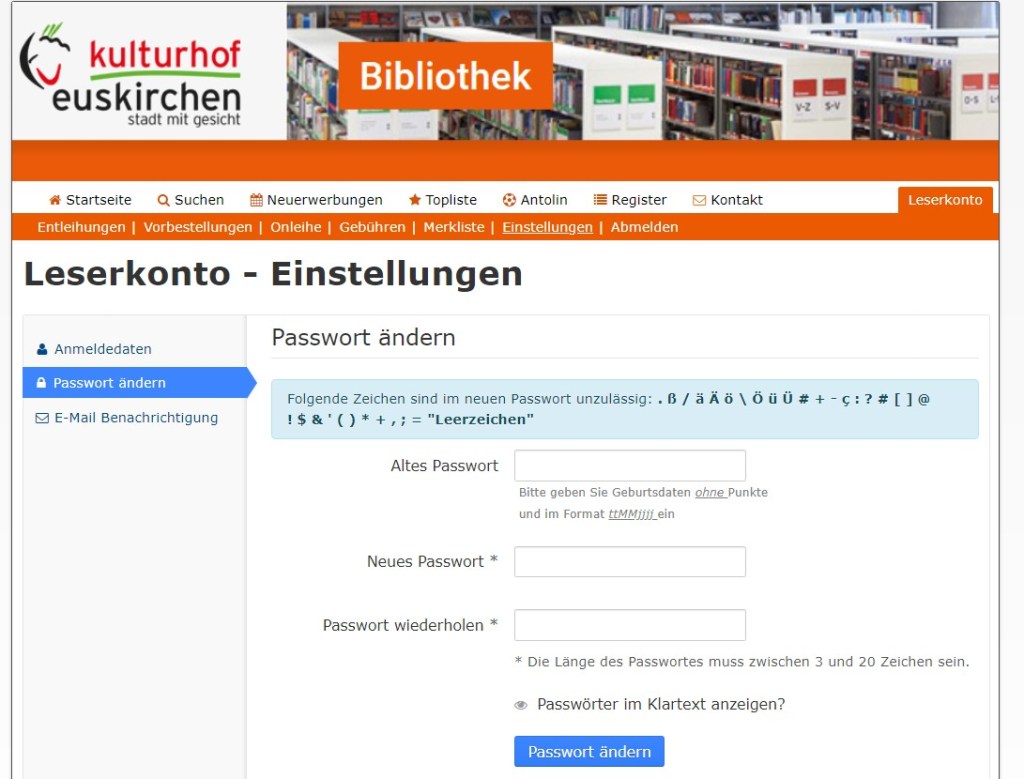 Das Standard-Passwort müsst Ihr in den Einstellungen Eures Online-Leserkontos abändern. Den Zugriff auf das Online-Leserkonto erhaltet Ihr über unseren Online-Katalog.