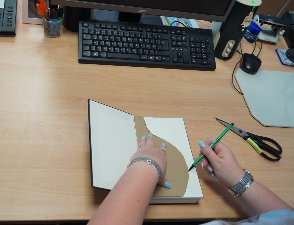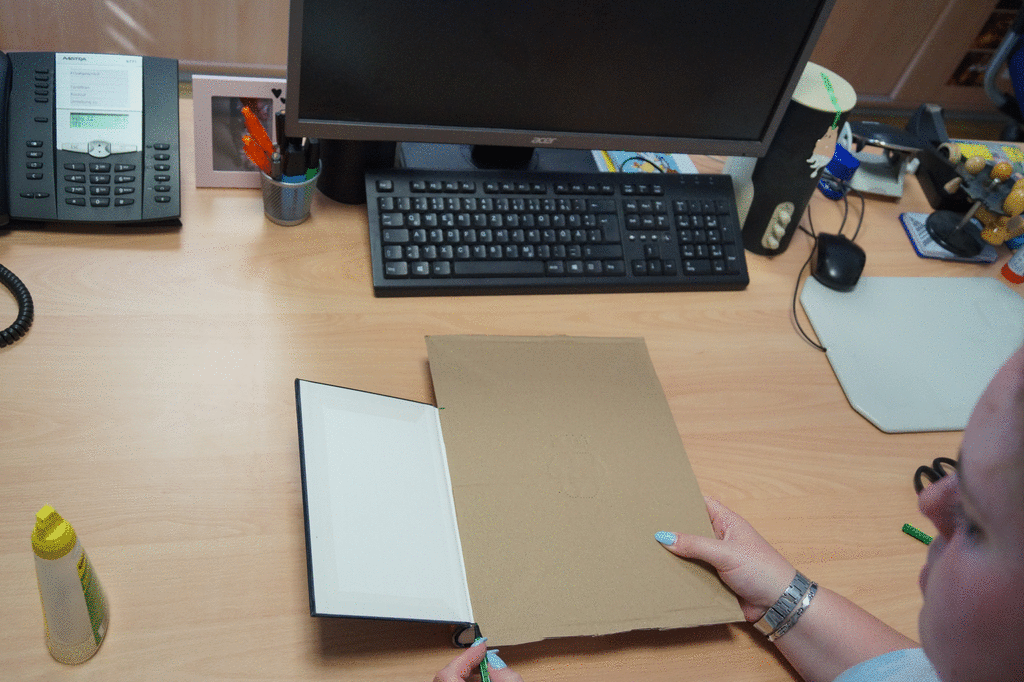 Hardcover Buch, ein Stück Pappe, Cuttermesser oder Schere, Stifte, Kleber, Heftklammern