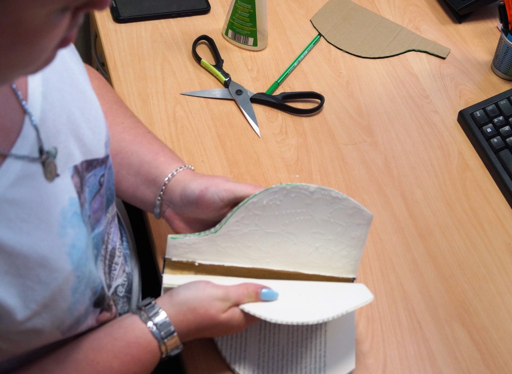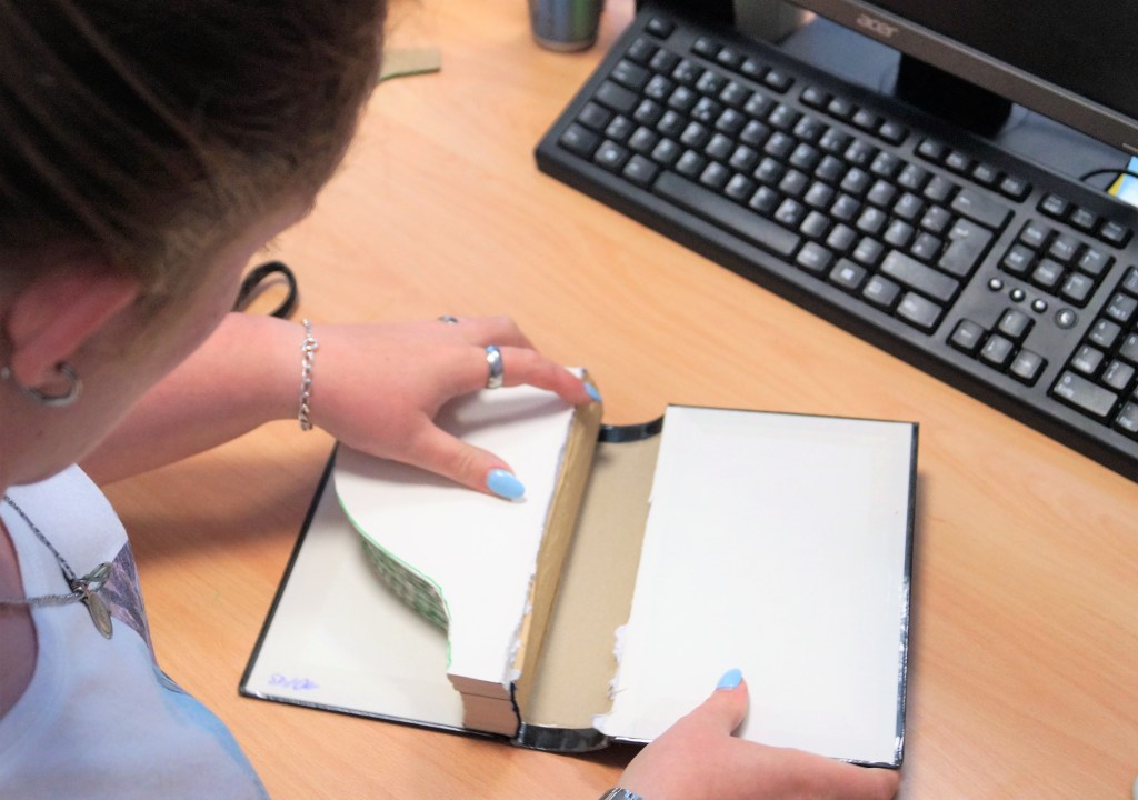 Das macht ihr mit dem Ganzen Buch bis ihr an der letzten Seite angekommen seid. Damit wir aber die Rundung wie eine Vase bekommen, müssen wir jetzt den Buchdeckel vorsichtig abtrennen.