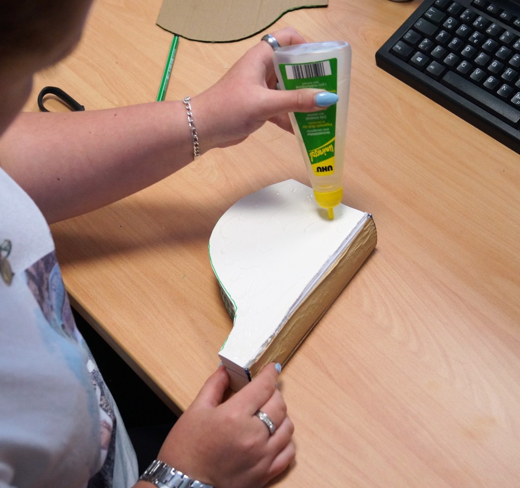 Wenn das geschafft ist nehmt ihr euren Kleber und klebt die erste und die letzte Seite zusammen. Am besten fixiert ihr die geklebten Seiten ggf. mit ein paar Heftklammern und lasst es Trocknen (am besten über Nacht).