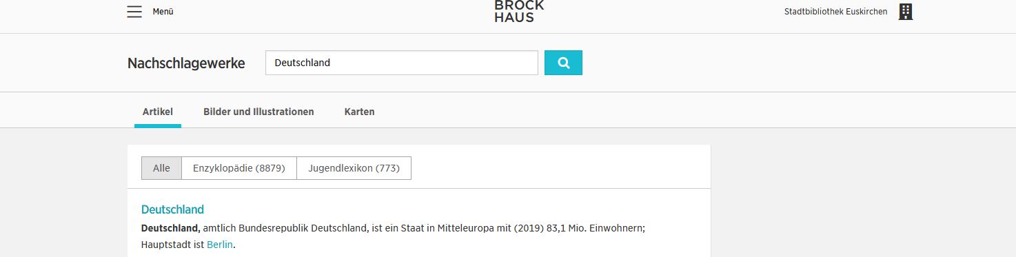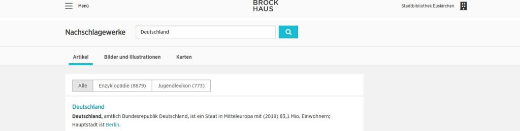 Wer den Brockhaus nutzen will, kann sich als registrierter Kunde der Stadtbibliothek auch von zuhause aus einloggen. Das geht entweder über die Recherche-Seite der Stadtbibliothek https://webopac.euskirchen.de/index.aspx oder über die kostenlose Brockhaus-App. Alle anderen Interessierten können vor Ort in der Bibliothek auf die Datenbank zugreifen.