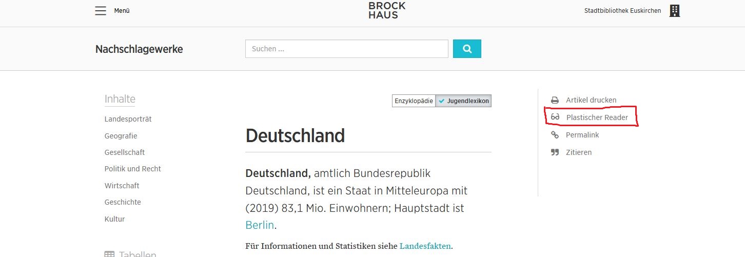 - den Artikel öffnen; rechts oben befindet sich der Plastische Reader