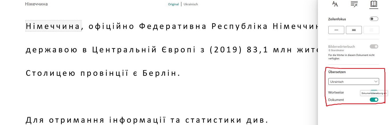 - den Plastischen Reader anklicken; oben rechts erscheinen weitere Symbole. Über das Symbol“Buch“ wird die Übersetzungshilfe geöffnet. Hier kann man sich eine beliebige Sprache aussuchen.