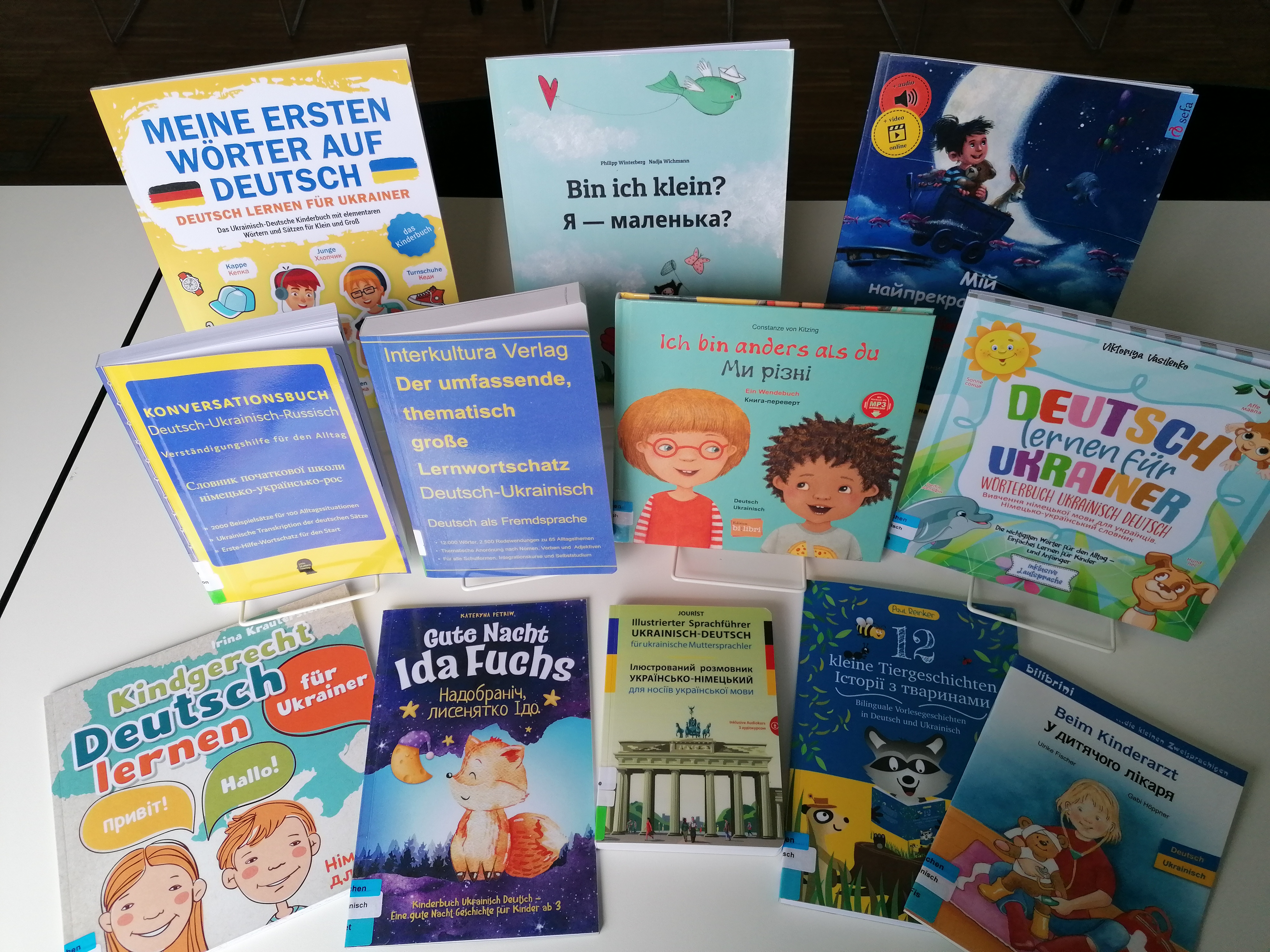 Aber auch vor Ort finden Sie mittlerweile ein kleines Angebot an ukrainischen Medien. Sie benötigen ein Wörterbuch? Wir haben sowohl Wörterbücher für Erwachsene als auch erste Wörterbücher für Kinder im Bestand. Besonderer Tipp: Für alle diejenigen, die gerne Deutsch lernen bzw. ihre Deutschkenntnisse verbessern möchten, bieten wir eine große Auswahl an Medien für Deutsch als Fremdsprache und Lektüren in einfacher deutscher Sprache an. Auch Ratgeber für Integrationshelfer haben wir vorrätig.