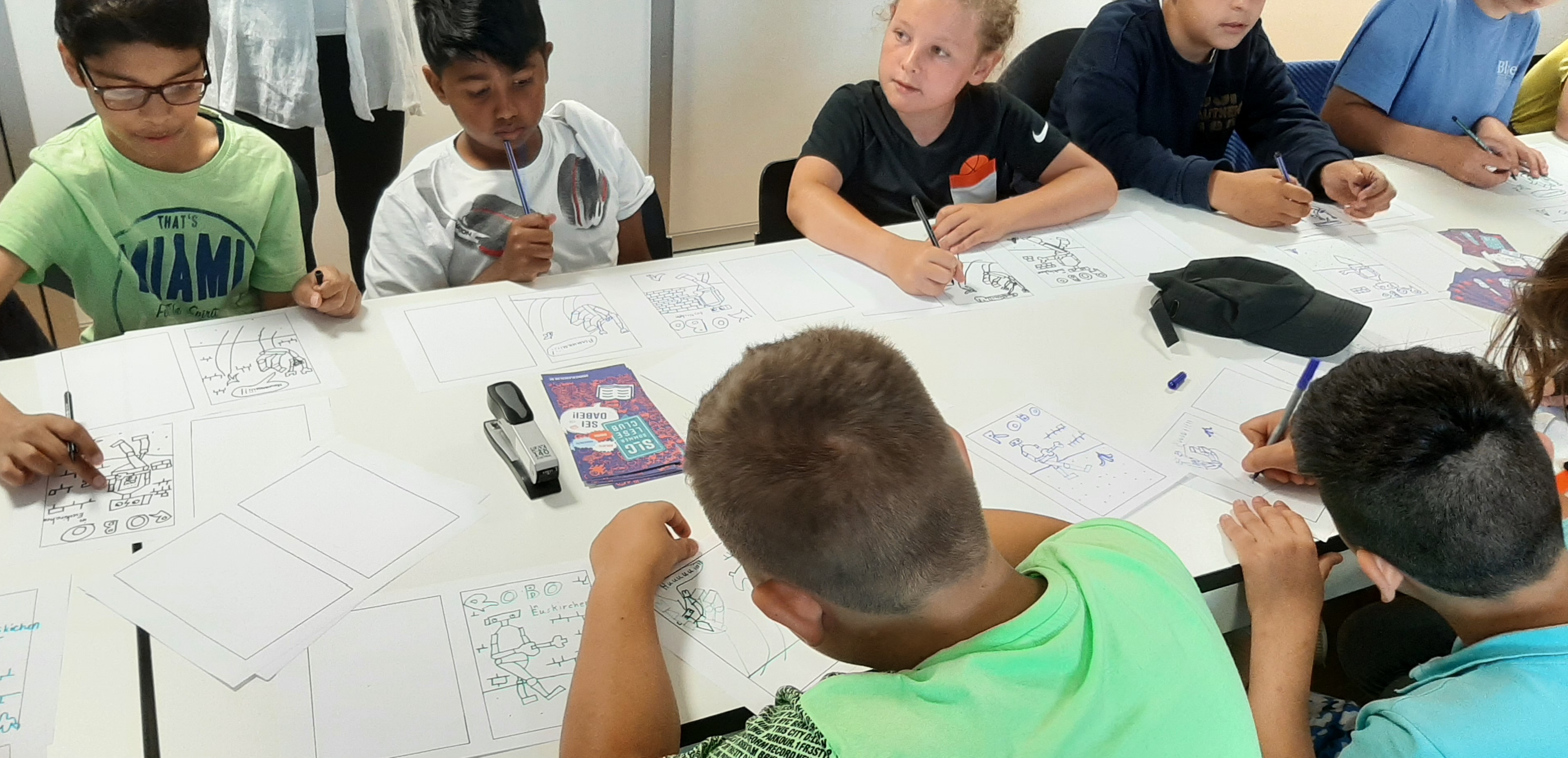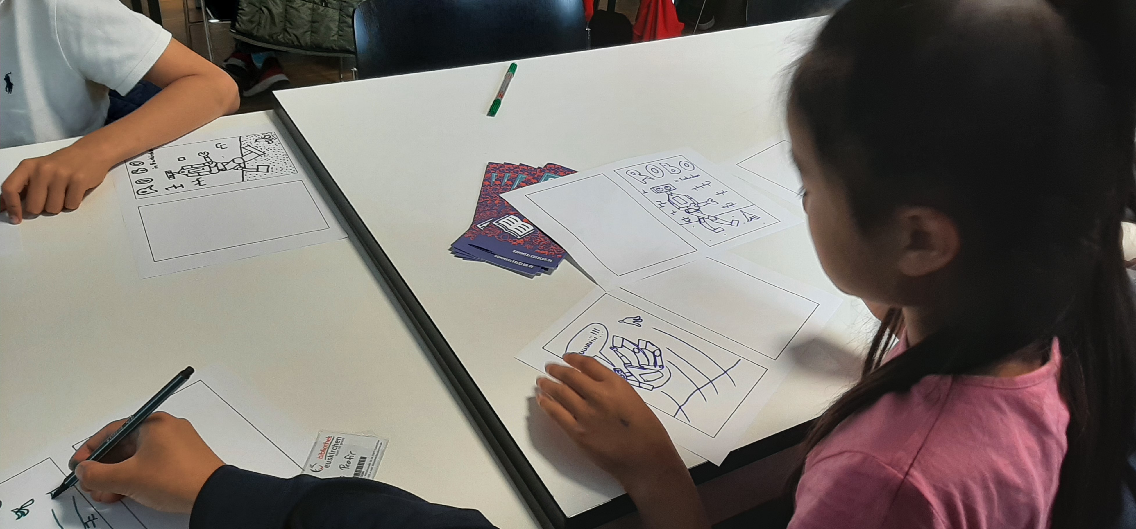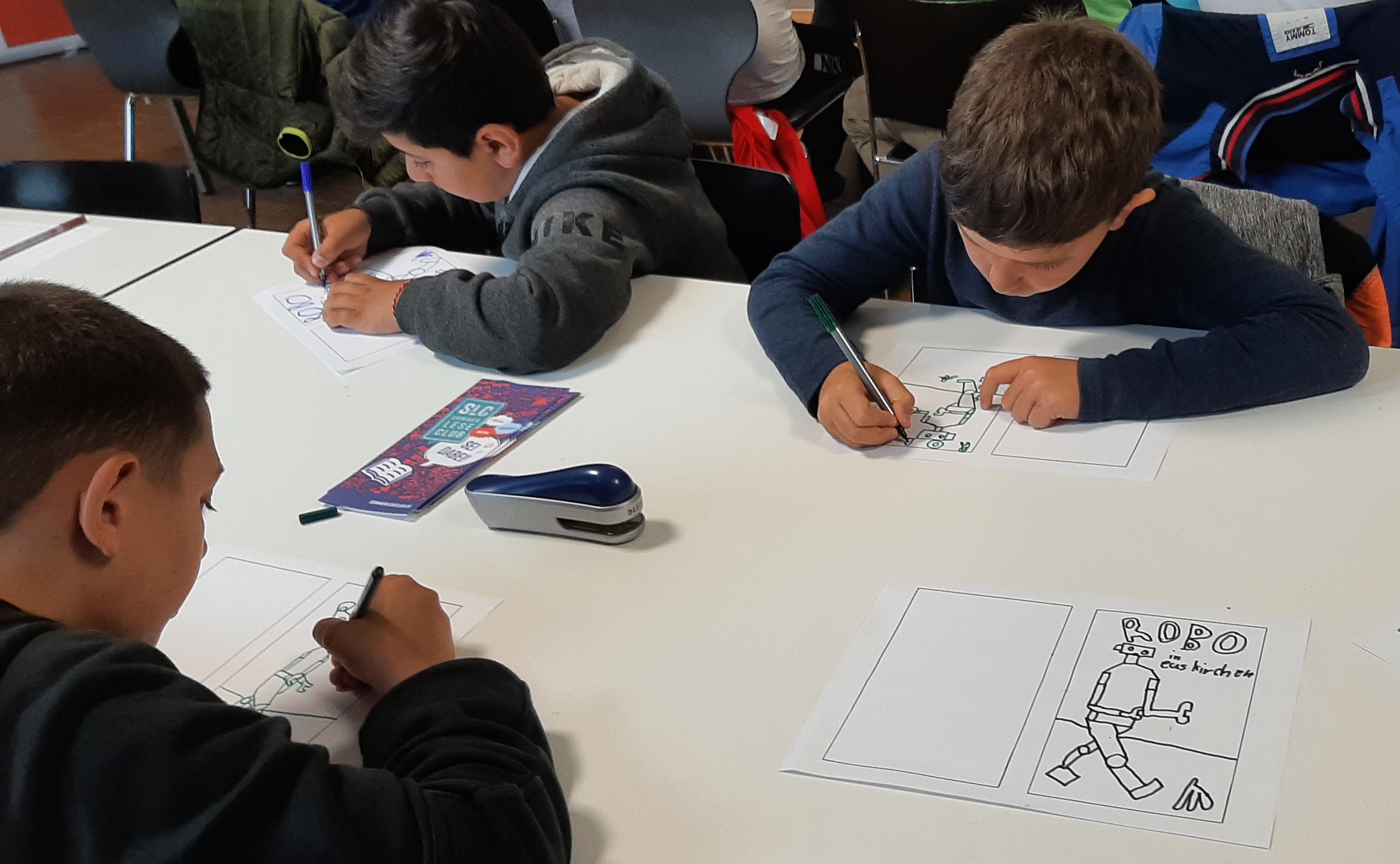 Zunächst einmal mussten sich die Kinder für eine Hauptfigur ihres Comics entscheiden. Ins Rennen gingen Affi, Ninja Girl oder Robo. Schnell war entschieden, dass Robo der Held des selbst gestalteten Comics werden sollte.