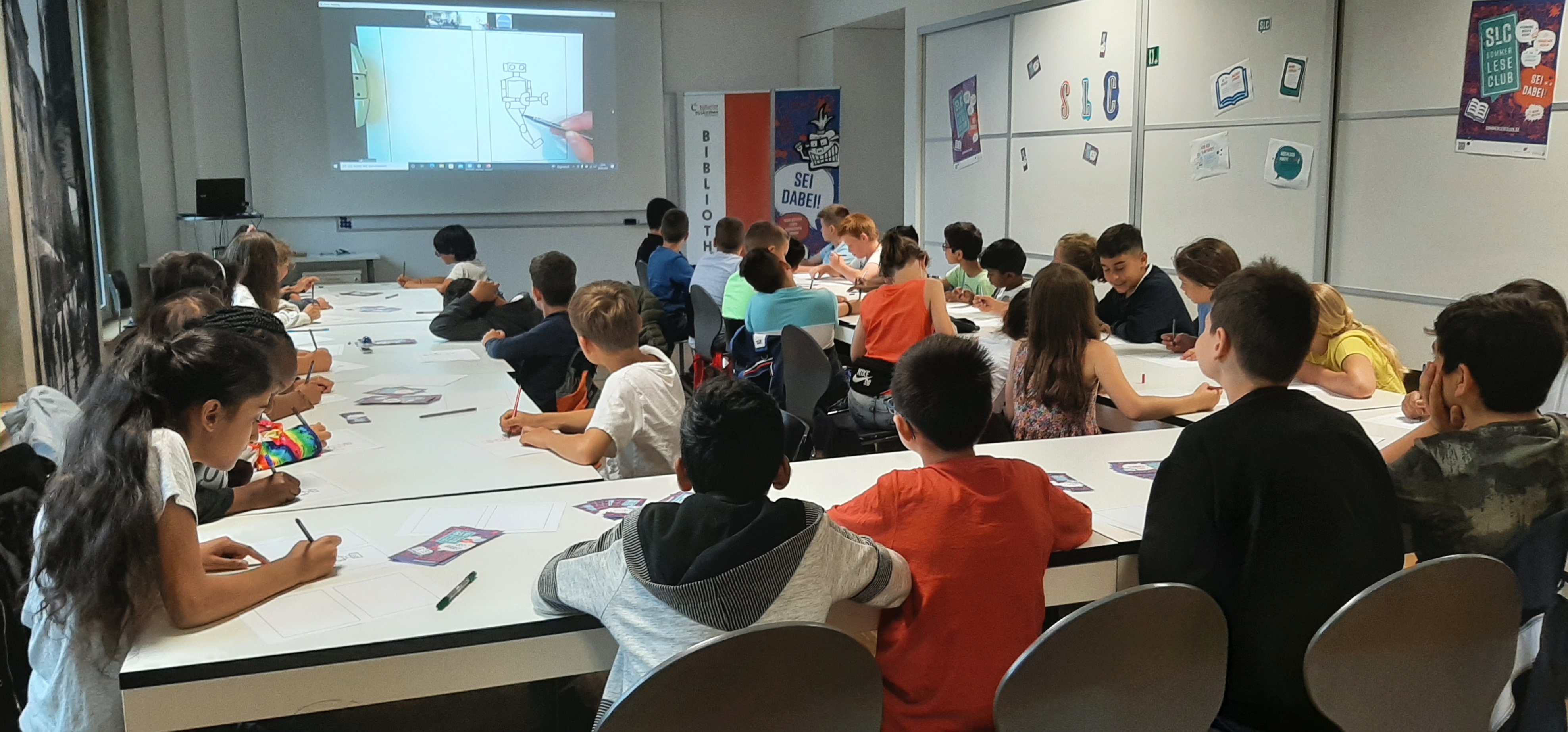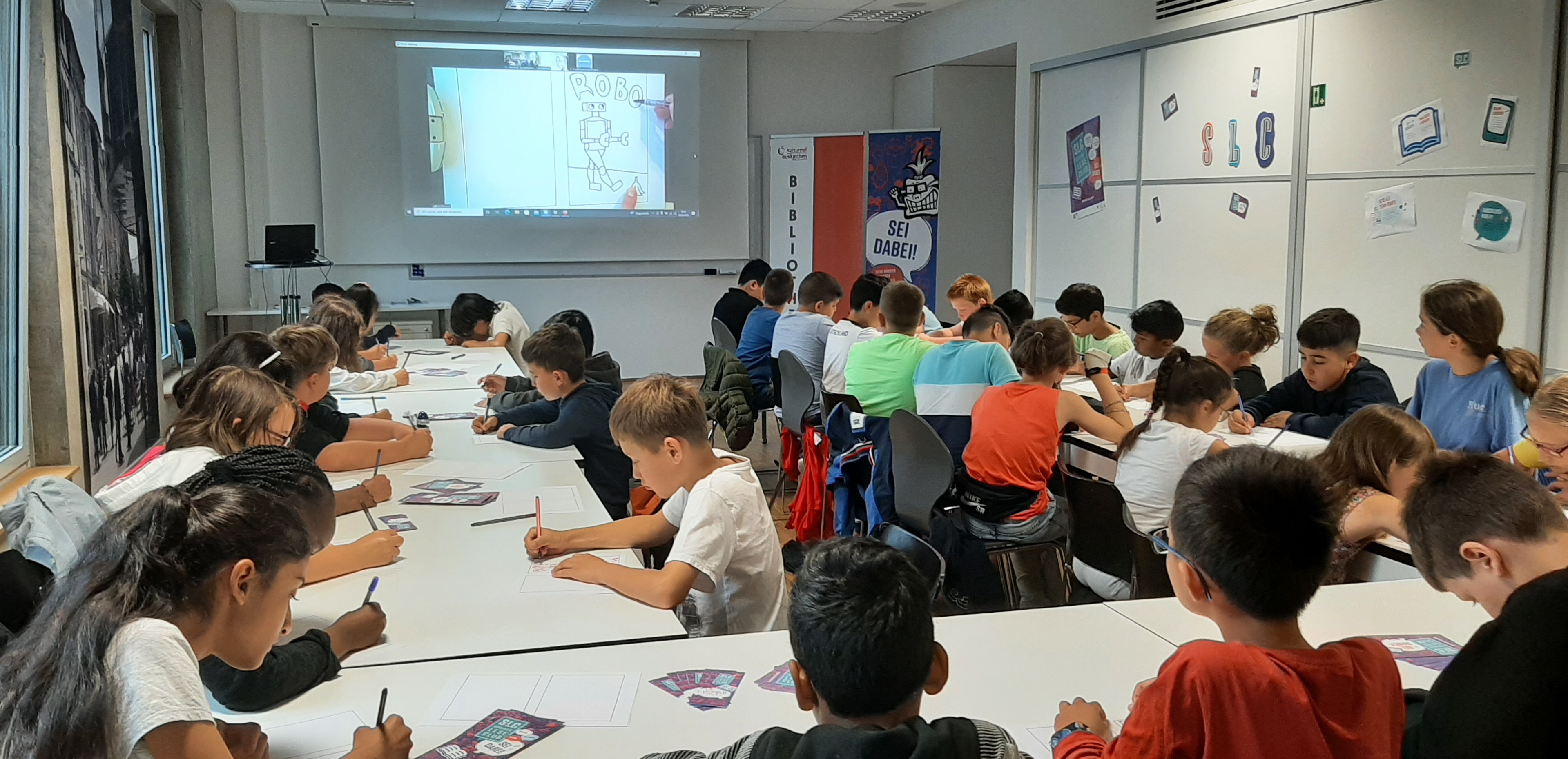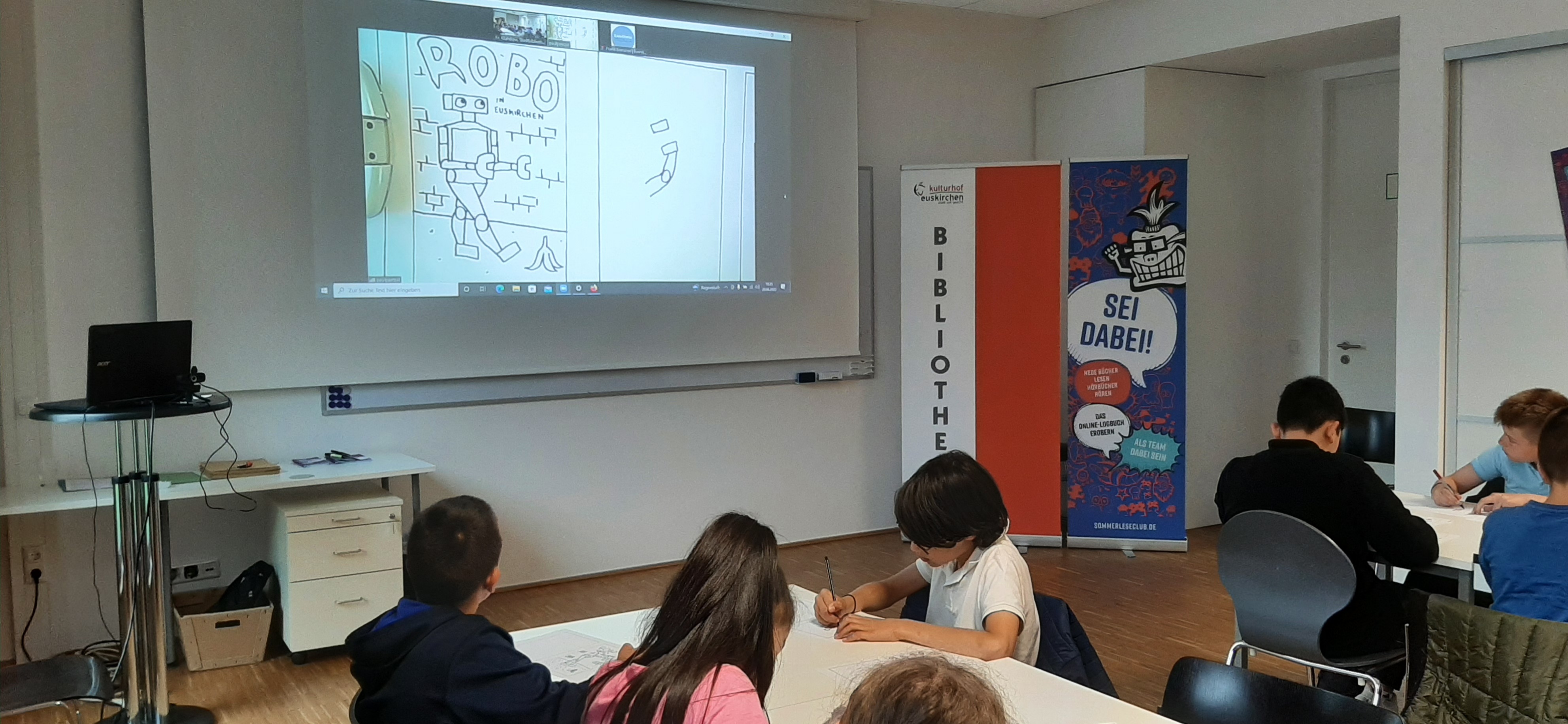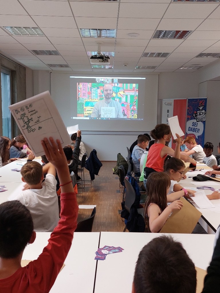 Per Stream-Übertragung konnten die Kinder die ganze Zeit Paul Paetzel beim Gestalten von Robo über die Schulter schauen und jede Linienführung ganz genau mitmachen.