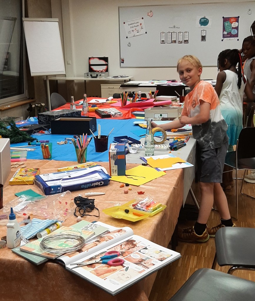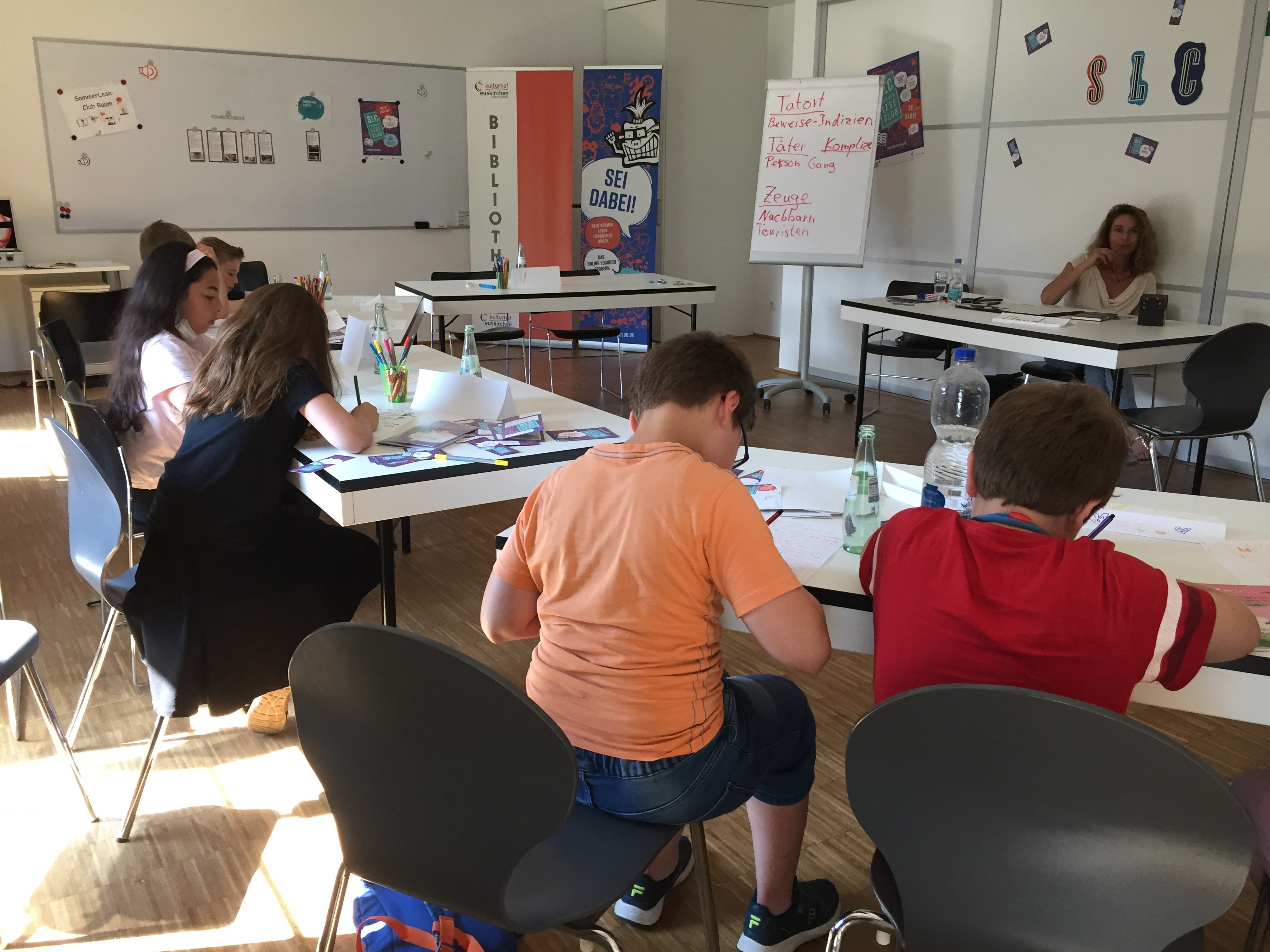Bei der „Kreativen Erzähl- und Schreibwerkstatt“ fanden sich Nachwuchsautor*innen im Clubbereich des Sommerleseclubs ein und entwickelten gemeinsam mit Autorin Claudia Satory viele interessante Ideen, wie man einen spannenden Krimi schreibt.