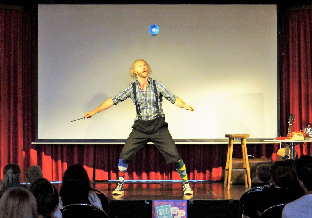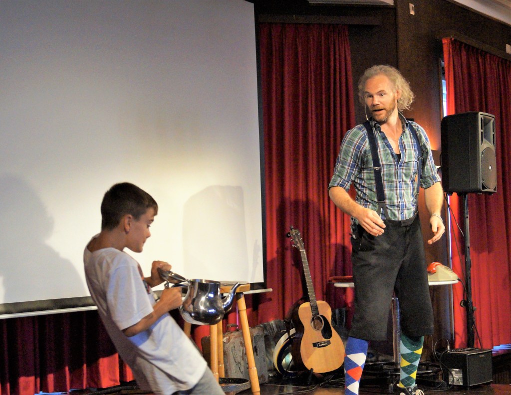 Mit viel Charme, Humor und kräftiger Unterstützung des anwesenden Publikums präsentierte er ein unterhaltsames Programm. Sei es das Umtexten von bekannten Kinderliedern, das Üben des Applauses mithilfe des Diabolos, eine Jongliereinlage mit tatkräftiger Hilfe eines Freiwilligen oder ein unterhaltsames Gespräch mit seinen drei Freunden, die er mitgebracht hat, jeder im Casino hatte seinen Spaß. Und Nils Buchholz verstand es hervorragend, alle Kinder und Erwachsene in seine Darbietung zu integrieren.