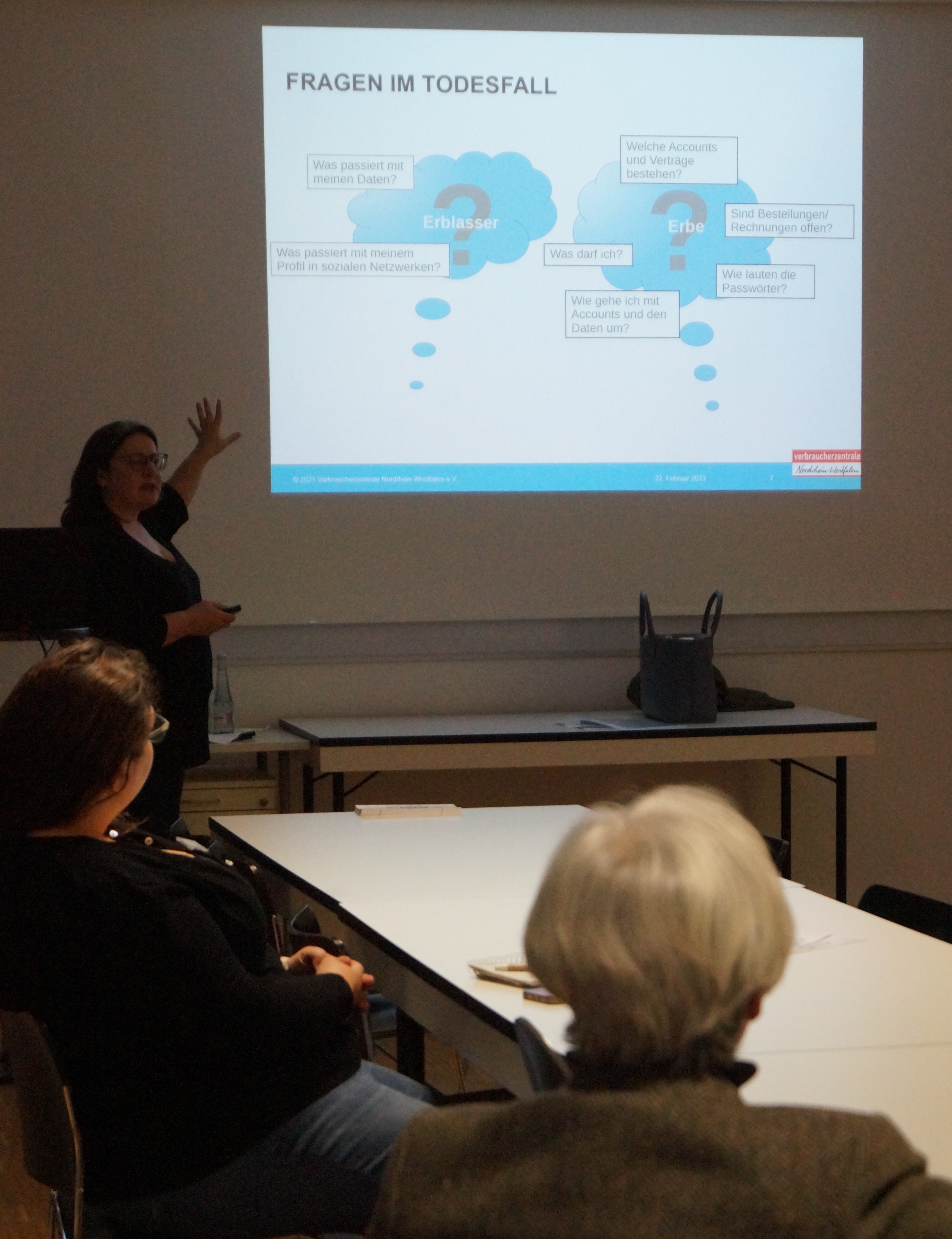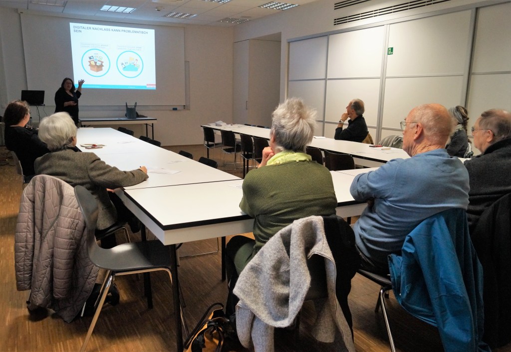 Eine gute Stunde lang lauschten die Teilnehmenden Frau Schiffer, während sie erklärte, wie der eigene digitale Nachlass zustande kommt und wie man am besten für den Ernstfall vorsorgen kann. Frau Schiffers Expertise aus ihrer beruflichen Praxis veranschaulichte den Zuhörenden fast schon bildlich die Dringlichkeit, sich auch um den eigenen digitalen Nachlass zu kümmern.