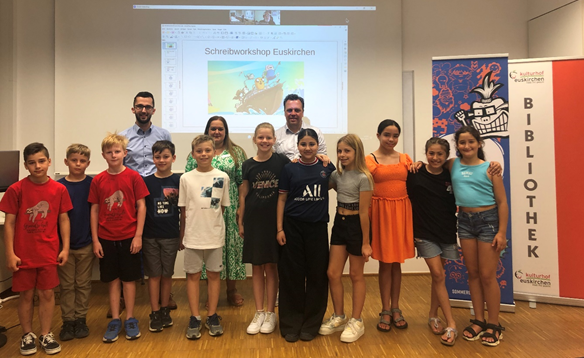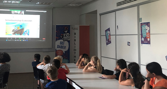 Besonders spannend für die Euskirchener Grundschüler war dabei, dass Peter Schwindt aus seinem heimischen Büro heraus exklusiv auf die große Leinwand im Seminarraum des Kulturhofes übertragen wurde. Die Kinder konnten sich dabei an der Entwicklung der Figuren und der Geschichte beteiligen und so Grundlagen des „Storytelling“ unmittelbar miterleben.