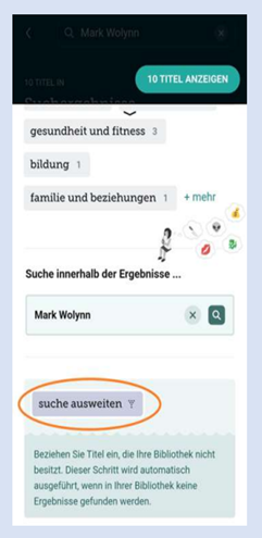 Wenn Ihre Bibliothek dies anbietet, versuchen Sie es mit Suche ausweiten. Dies ist die gleiche Methode, die auch bei der Empfehlung eines Titels für Ihre Bibliothek verwendet wird. Sie ermöglicht es Ihnen, Titel zu entdecken, die nicht in der Sammlung Ihrer Bibliothek vorhanden sind.