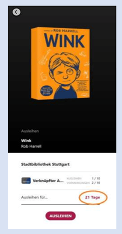Die Leihfristen sind je nach Format und Bibliothek unterschiedlich. Nachdem Sie bei einem Titel auf Ausleihen getippt haben, wird die Leihfrist auf dem Bestätigungsbildschirm angezeigt. Tippen Sie auf die Leihfrist, um die Leihfrist zu ändern. Wenn Sie eine Ausleihe vorzeitig zurückgeben möchten, gehen Sie zu Ihrem Regal und tippen Sie auf Ausleihe. Tippen Sie dann auf Ausleihe Verwalten und Vorzeitig zurückgeben.