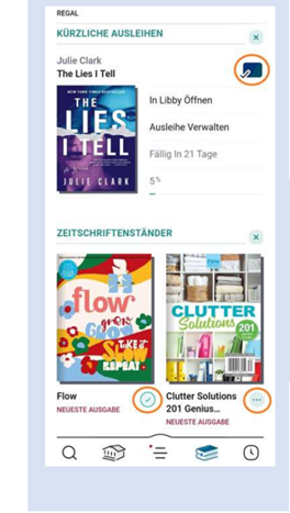 Bücher und Hörbücher sind in Ihrem Regal mit einem Karten- und Häkchensymbol gekennzeichnet, wenn sie heruntergeladen wurden, oder mit einem Wolkensymbol, wenn sie nicht heruntergeladen wurden. Zeitschriften haben ein Häkchensymbol, wenn sie heruntergeladen wurden, oder ein Drei-Punkte-Symbol, wenn sie nicht heruntergeladen wurden. Standardmäßig versucht Libby, Ihre ausgeliehenen Bücher und Hörbücher herunterzuladen, wenn Sie über eine Wi-Fi-Verbindung verfügen. Sie können Ihre Download-Einstellungen anpassen, indem Sie zu Menü > Einstellungen > Download-Regeln ändern gehen. Zeitschriften werden nicht automatisch heruntergeladen, um Speicherplatz auf Ihrem Gerät zu sparen, aber Sie können jede Zeitschrift, die Ihre Bibliothek anbietet, manuell herunterladen.