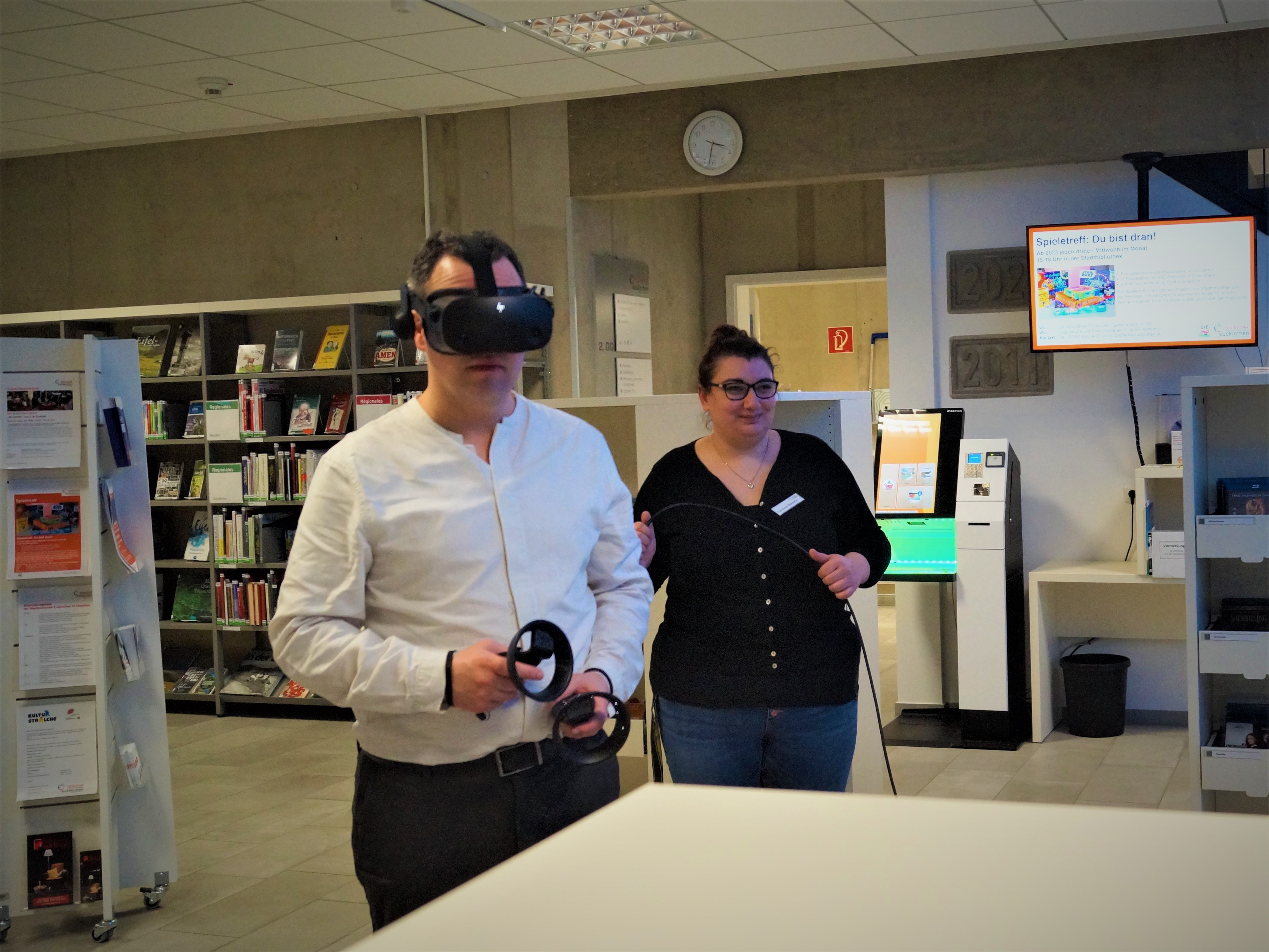 Im Januar 2023 führten wir unseren VR-Nachmittag ein. Bürgermeister Sacha Reichelt kam extra zur Eröffnung und begab sich in die Weiten des Weltalls. Für alle Interessierten stehen verschiedene VR-Anwendungen zum Ausprobieren zur Verfügung. Der Schwerpunkt liegt auf Bildungsangeboten, wie z.B. die Erkundung fremder Länder, eines Bergwerks oder der Besuch auf der ISS Raumstation. Es kann aber auch spielerisch gelernt werden mit einem virtuellen Escape-Game oder der Erschaffung einer eigenen Galaxie.