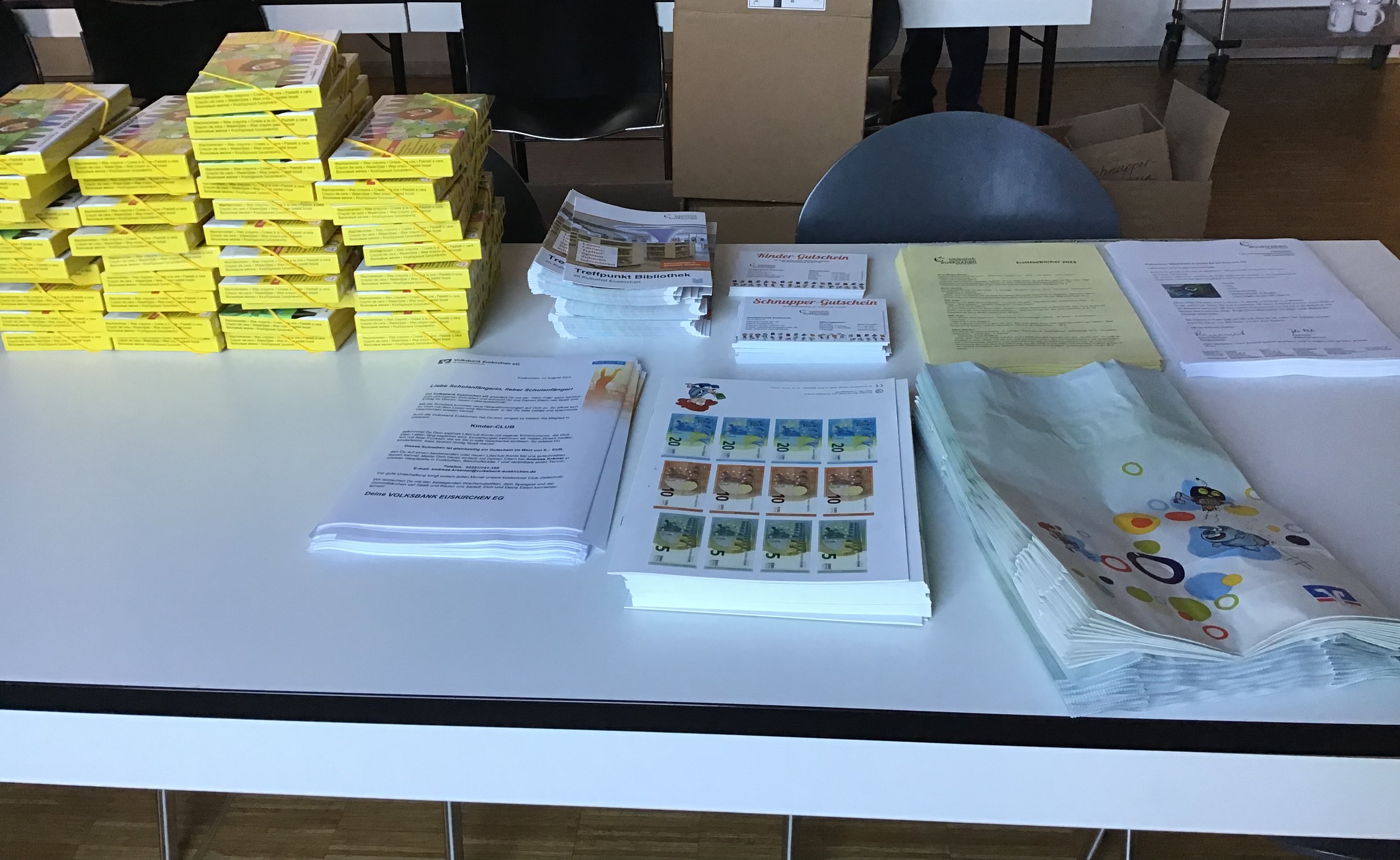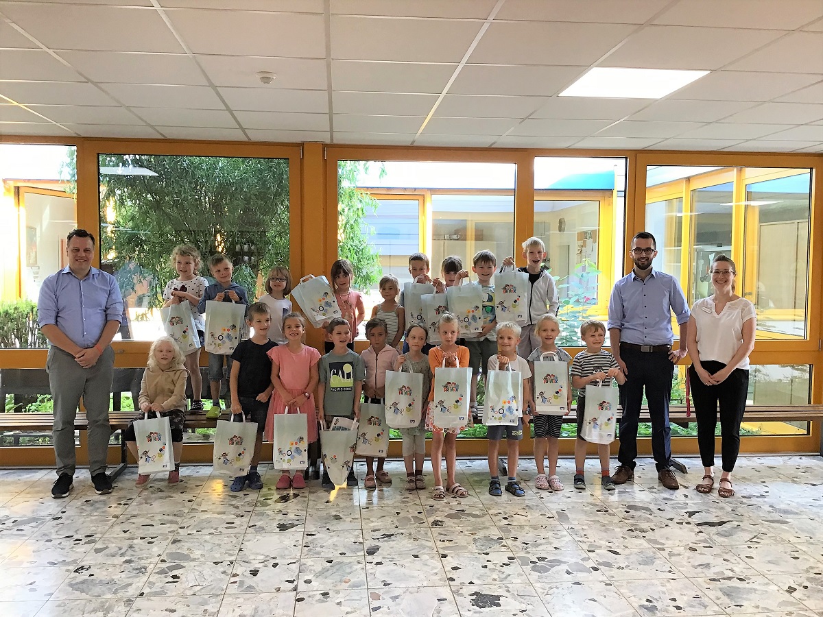 Im August 2023 fuhren wir gemeinsam mit Vertreter*innen der Volksbank mit vollgepackten Autos zu den Grundschulen im Kreis und verteilten unsere ABC-Tüten an alle Erstklässler. Rund 700 Kinder bekamen die beliebte Tüte ausgehändigt, in denen sich unter anderem kostenlose Bibliotheksausweise für die Kinder und Schnuppergutscheine für die Eltern befanden.