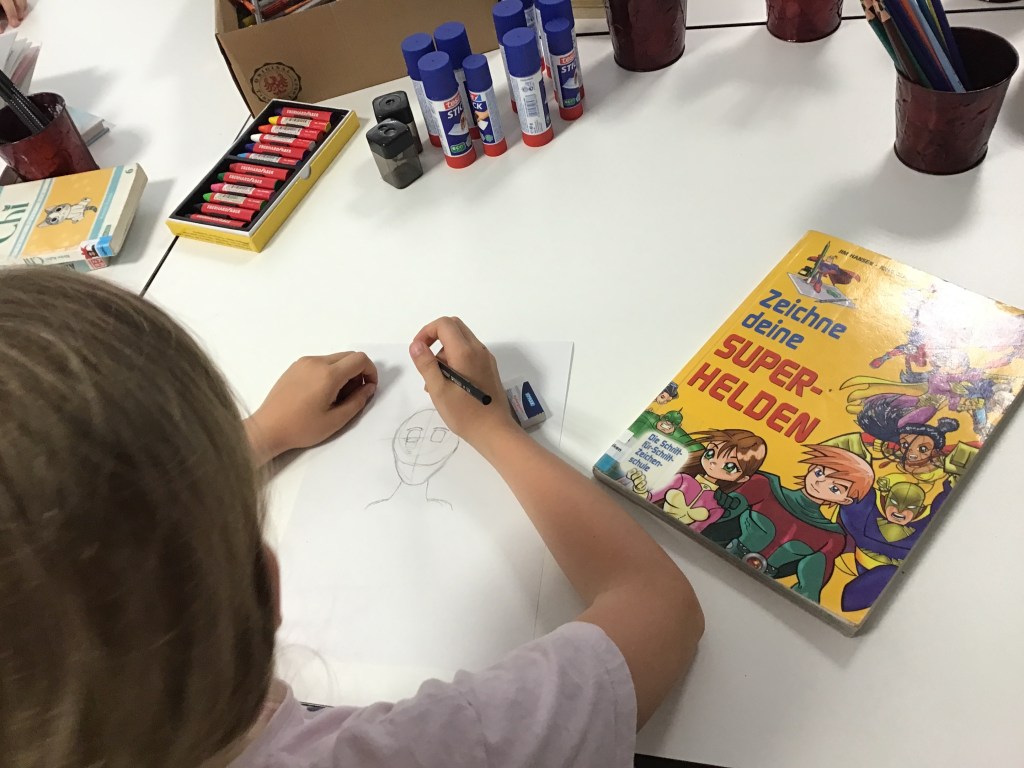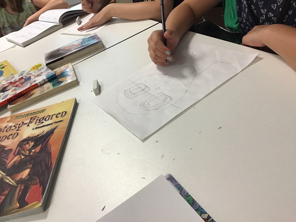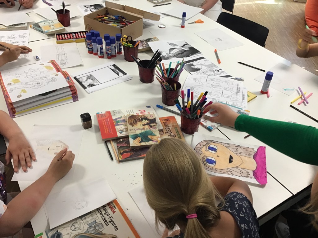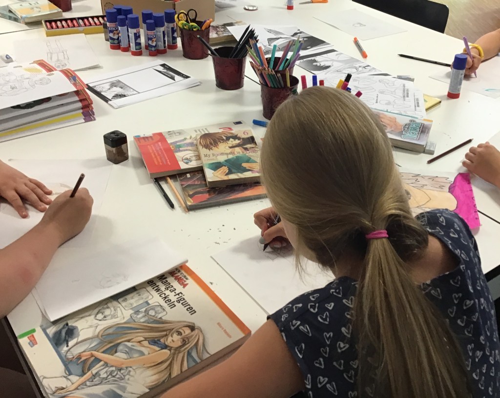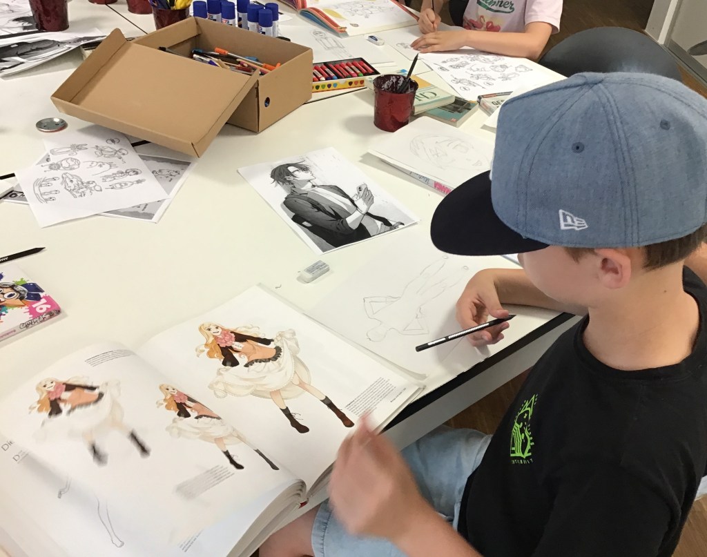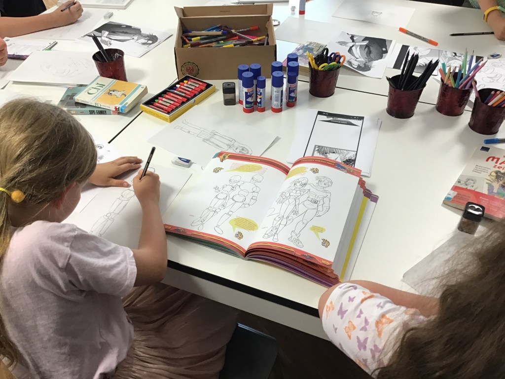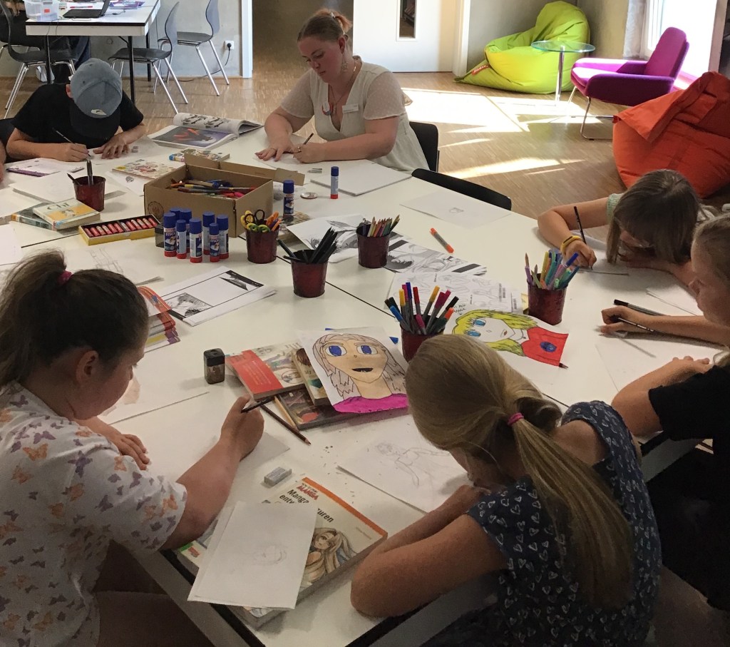 Direkt am darauffolgenden Tag, Donnerstag 18.07.2024, wurde unser Clubraum zu einem Grafik-Atelier. Den gesamten Nachmittag über konnten die Teilnehmenden des Zeichenkurses die Grundlagen des Zeichnens für Comic-Figuren im Manga-Stil erlernen und direkt anwenden. Dabei sind erstklassige Zeichnungen entstanden.