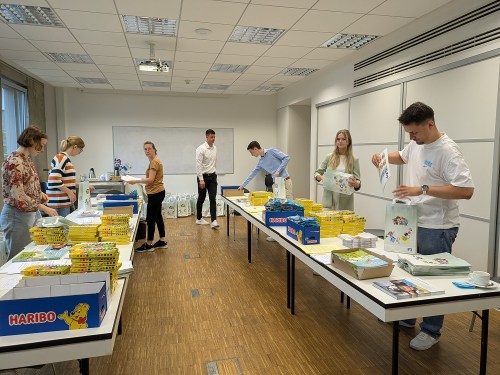 In den darauffolgenden Tagen waren Mitarbeiter*innen der Stadtbibliothek und der Volksbank gemeinsam in allen Grundschulen Euskirchens unterwegs, um fast 780 Kindern die Tüten persönlich vorbeizubringen. Und in jeder Schule wurden die Teams mit großer Begeisterung empfangen. Denn natürlich waren alle Kinder sehr gespannt auf die ABC-Tüten, da der Inhalt bei den Kindern sehr begehrt ist: in den Tüten befindet sich nämlich unter anderem ein Kinder-Gutschein für einen kostenlosen Bibliotheksausweis der Stadtbibliothek sowie eine dreimonatige kostenlose Schnuppermitgliedschaft für deren Eltern. Außerdem liegt eine eigens erstellte Empfehlungsliste „Erstlesebücher 2024“ bei sowie ein Elternbrief in Einfacher Sprache. Die Volksbank Euskirchen gab wieder einige passende Überraschungen dazu – zum Beispiel Wachsmalstifte, Spielgeld und Gummibärchen.