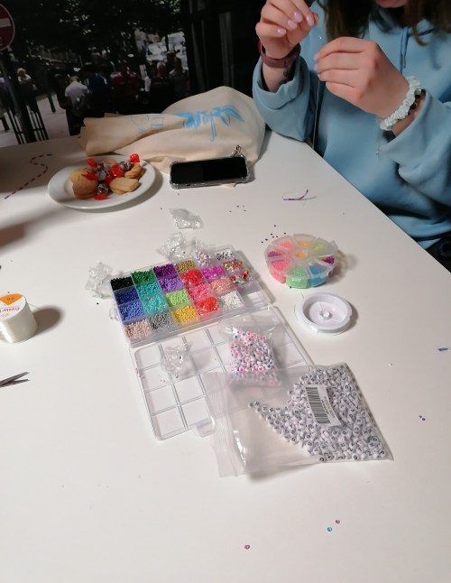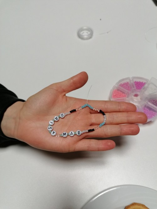 In ganz entspannter Atmosphäre las Lea ein paar ausgewählte Passagen aus ihrem Buch vor, während die meisten ihrer Zuhörer*innen sich fleißig daran begaben, Freundschaftsbändchen zu basteln. Denn Lea hatte für unser Publikum jede Menge Material mitgebracht, damit es sich kreativ beschäftigen konnte. Und dabei kamen tolle Ergebnisse zustande.