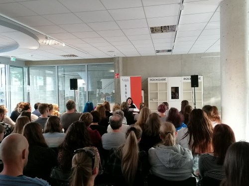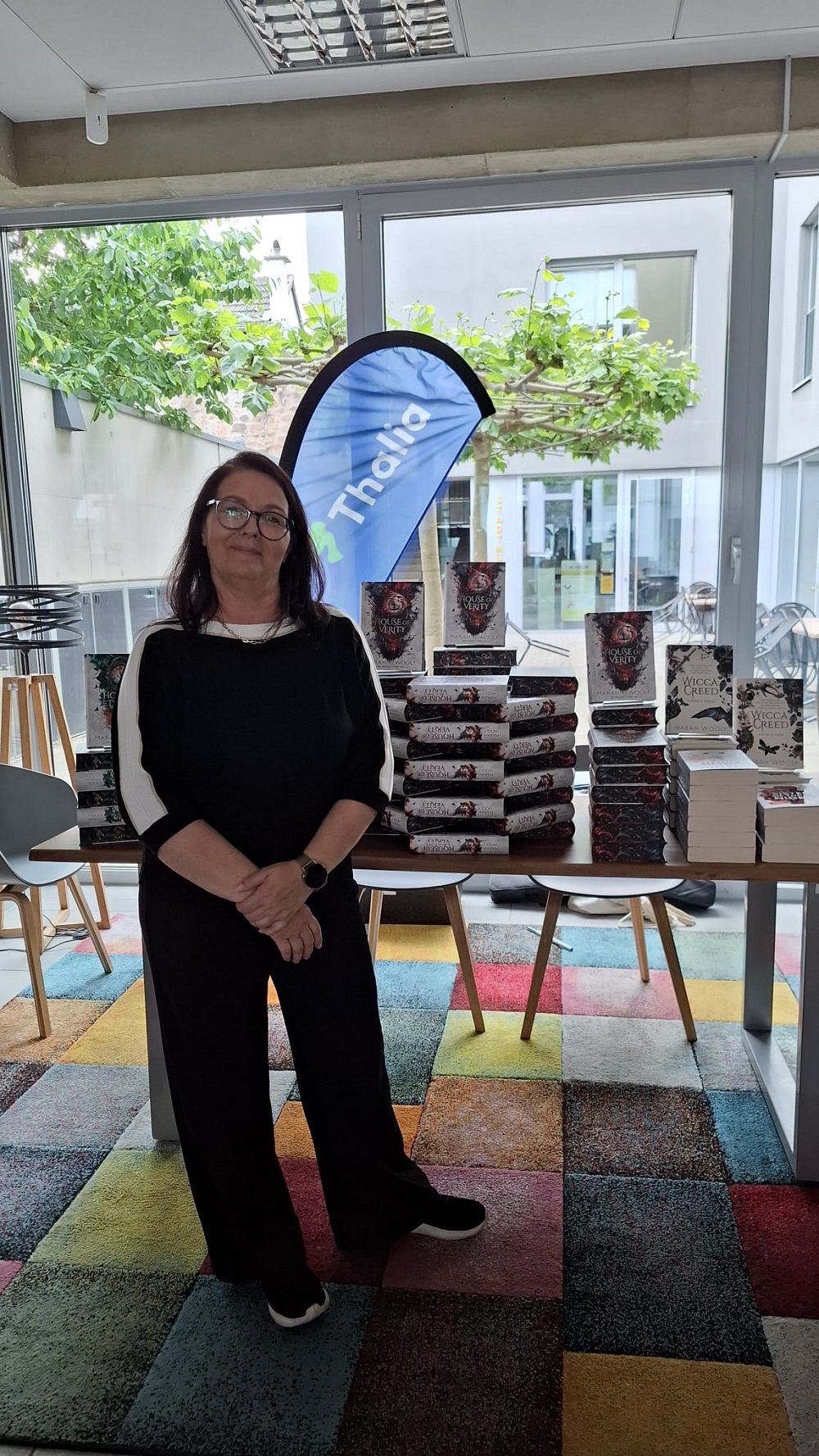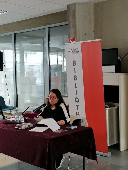 Auf das Euskirchener Publikum (das dieses Mal auch einen erfreulichen Anteil an männlichen Lesern aufwies) wartete eine ganz besondere Überraschung: denn extra nur für uns las die Autorin Marah Woolf aus ihrem Abschlussband der Zodiac-Chroniken „House of Verity“ vor.