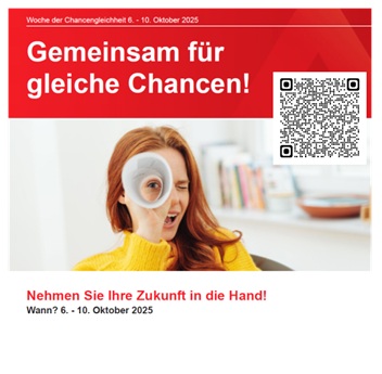 Vom 06.10.2025 bis zum 10.10.2025 findet die NRW-weite Woche der Chancengleichheit statt. Die Beauftragten für Chancengleichheit am Arbeitsmarkt haben ein umfangreiches Programm zusammengestellt, damit ihr eure Zukunft aktiv gestalten könnt.