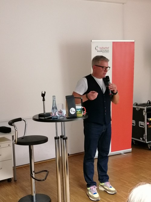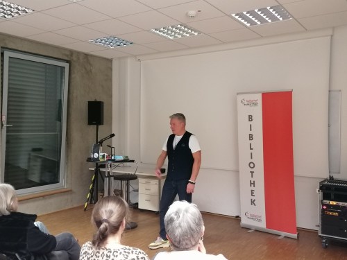 Zum Einstieg – damit man ihn besser kennenlernen konnte – erzählte er dem Publikum kleine Anekdoten aus seinem Leben. Danach ging es sofort mit dem ersten Kapitel seines Buches los. Um die Spannung aufrecht zu erhalten beendete Andreas Winkelmann seine Passagen immer mit einem Cliffhanger. So machte er die Besucher*innen neugierig auf sein neuestes Werk.