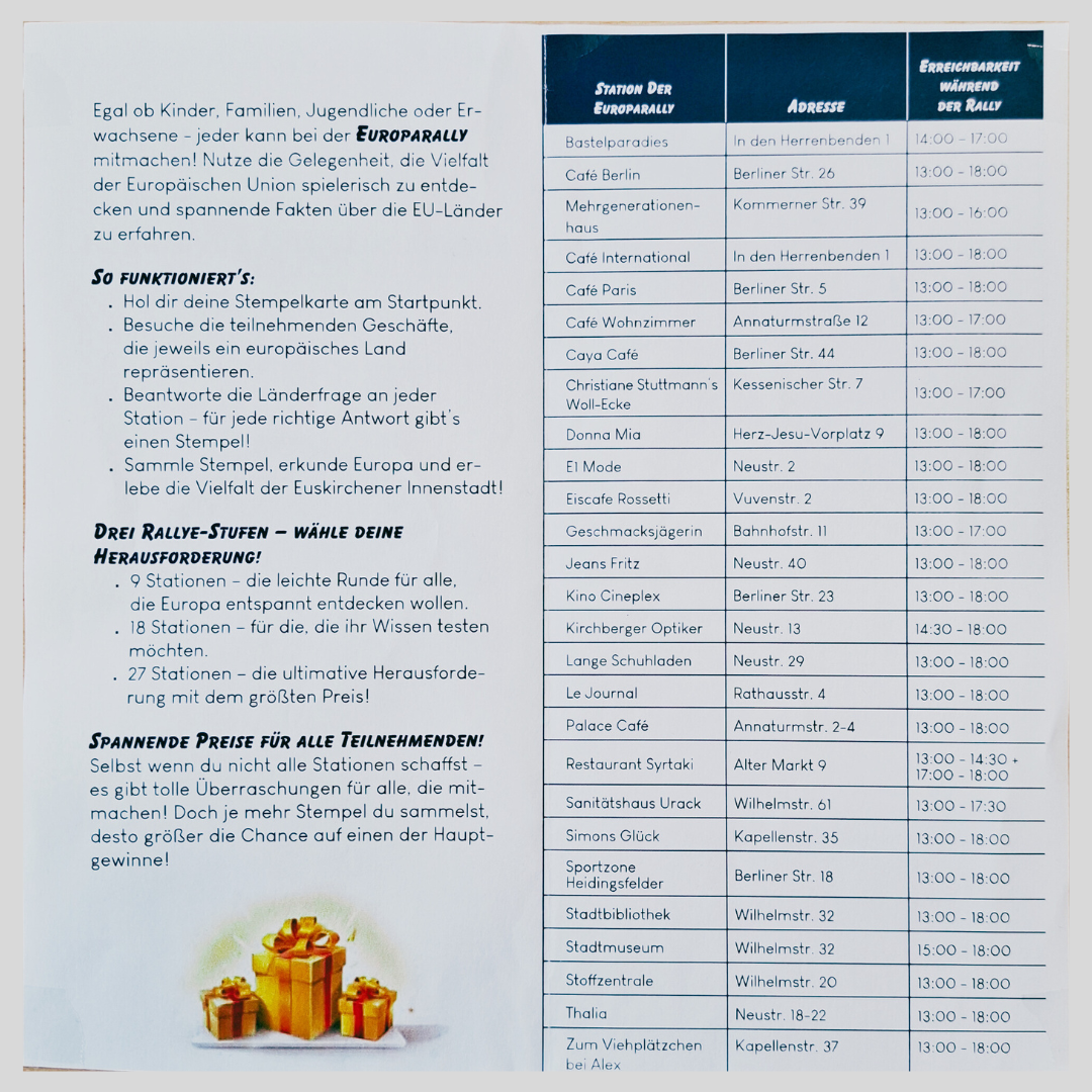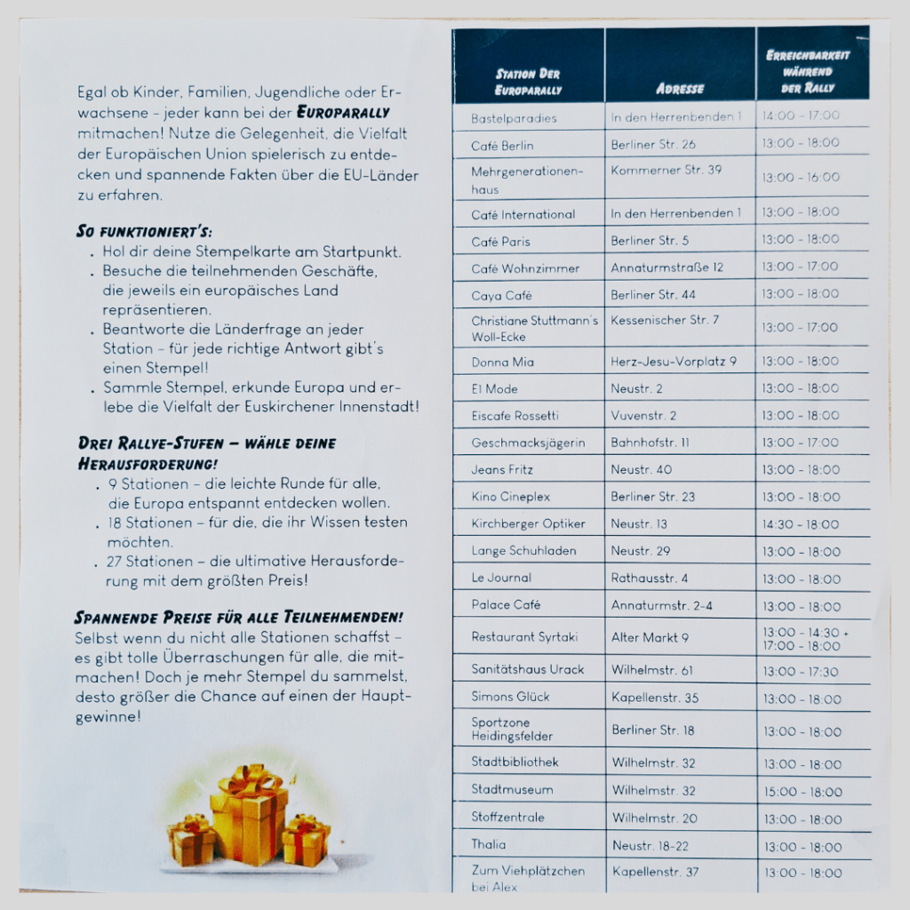 Ganz einfach: ihr holt euch am Europastand der Kreisverwaltung am Klosterplatz eine Stempelkarte ab und legt los. Zunächst entscheidet ihr, wie viele Stationen ihr besuchen möchtet. Ihr habt die Wahl zwischen 9 (kleine Runde), 18 (mittlere Runde) oder 27 (große Runde) Stationen. Dann begebt ihr euch zu den teilnehmenden Geschäften in der Innenstadt. Diese sind auf der Rückseite der Stempelkarte aufgelistet und repräsentieren einen Mitgliedsstaat der Europäischen Union. Dort bekommt ihr dann eine Frage zu dem entsprechenden Land gestellt, die ihr möglichst korrekt beantworten solltet. Dafür erhaltet ihr dann einen Stempel für das „besuchte Land“. Je mehr Stempel ihr sammelt, desto größer ist die Chance auf einen Hauptgewinn. Aber auch wenn ihr nicht alle Stationen schafft, bekommt ihr am Ende eine kleine Überraschung.