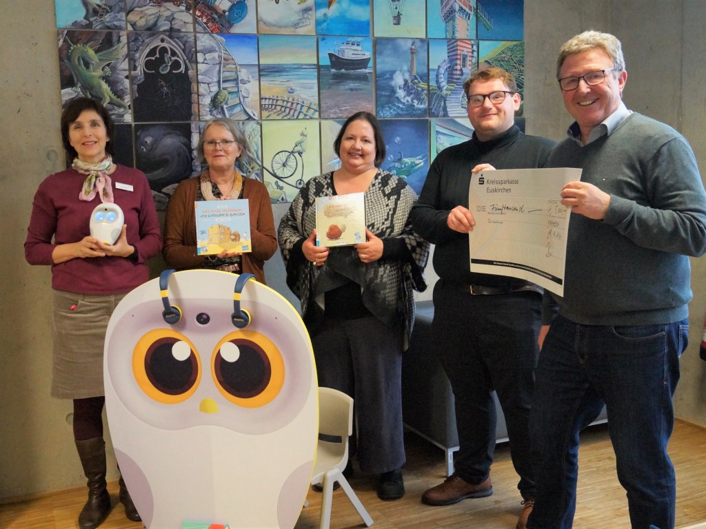 Luka, so heißt diese entzückende Plastik-Eule, liest gedruckte illustrierte Kinderbücher vor. Dank der eingebauten Kamera und Software erkennt Luka jede einzelne Seite und liest dort, wo das Buch gerade aufgeschlagen ist. So unterstützt sie das eigenständige Lesen von Kindern im Alter ab drei Jahren, wann immer sie Lust dazu haben. Die Eule soll dabei Lust aufs eigenständige Lesen machen, den Wortschatz erweitern und die kindliche Sprachentwicklung fördern. Denn tägliches Vorlesen verschafft Kindern einen deutlichen Vorsprung beim Lesenlernen – und gelesene Geschichten beflügeln die Fantasie und Kreativität. Das möchten wir nicht nur in deutscher Sprache, sondern auch in den vielen anderen Herkunftssprachen der Kinder Euskirchens ermöglichen.